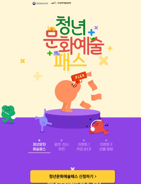 문화체육관광부는 한국문화예술위원회와 함께 3월 28일(목)부터 올해 19세가 되는 2005년생 청년에게 공연과 전시 예매에 최대 15만 원을 지원하는 청년 문화예술패스를 발급합니다. 28일(목) 오전 10시부터 신청순으로 발급한다고 하니 아래 링크를 통해 서둘러 신청하시고 뮤지컬, 클래식, 연극 등의 공연과 전시회를 관람하시기 바랍니다