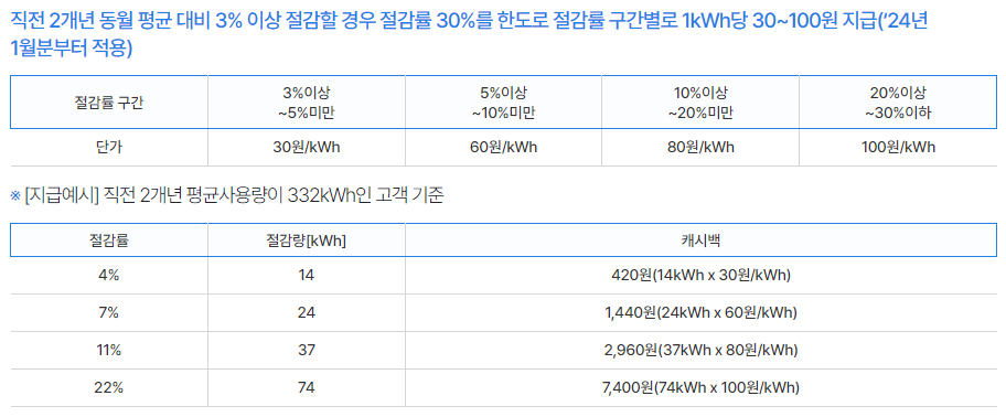 에너지 캐시백은 주택용 전기를 사용하는 세대가 직전 2개년 동월 평균 대비 3% 이상의 전기 사용량을 절감한 경우 할인 혜택을 받을 수 있습니다. 캐시백 금액은 30% 한도 내에서 1kWh(킬로와트시)당 30~100원까지 차등하게 캐시백을 적용받을 수 있습니다.