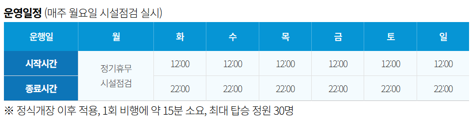 서울달은 1회당 최대 30명까지 탑승할 수 있으며, 월요일을 제외한 화요일부터 일요일 정오부터 22시까지 운영됩니다.